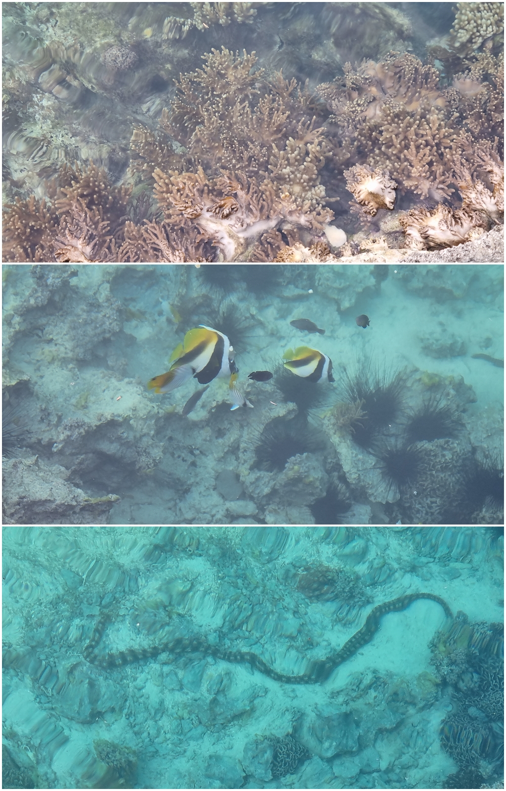 사진 사진 뿐만 아니라 눈으로 보는 재미도 쏠쏠하다.말 그대로 애메랄드 색의 바다 속에 헤엄치는 형형색색의 물고기들과성게, 산호초, 물뱀?? 등~~자연 수족관이라는 별명이 붙을만한 곳이다.