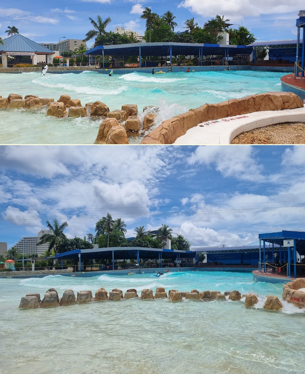 괌 최대, 아니 마이크로네시아에서 최고의 워터파크 시설을 보유한 온워드 비치 리조트는 그야말로 액티비티하다.총 길이가 360m에 달하는 리버 풀을 따라 튜브를 타고 유유자적 흘러 다녀도 되고, 인공 파도가 너울거리는 수영장에서 놀아도 유쾌해진다.높으면서 경사가 있어 어른들에게도 짜릿한 워터 슬라이드는 겁 없는 사람이라면 꼭 타보아야 한다. 무서운 듯 하지만 계속 타게 되는 중독성이 강한 놀이 시설이다.어른만 즐거운 곳이 아니다. 키즈풀도 있어 아이들도 안전하게 물놀이를 즐기도록 마련되어 있다.5개의 슬라이드와 6개의 수영장을 갖춘 온워드의 워터파크가 더 반가운 이유는 한적함 때문이다. 물 반 사람 반의 파도풀도 아니고, 30분이나 한 시간씩 줄을 서서 기다렸다 잠깐 타는 워터 슬라이드가 아니어서 좋다. 지치지만 않는다면 어느 때고 무한 반복해 시설들을 이용할 수 있다.