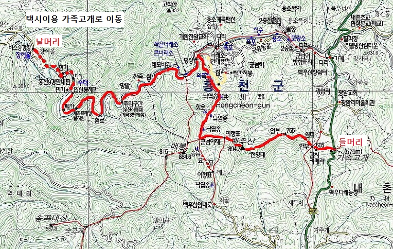 콜택시를 타고 가족고개에 도착 백우산으로 향한다.가족고개는 홍천군 내촌면 광암리 가족동(可足洞)에서 도관리로 넘나드는 고개를 말하는데,광암리 가족동(可足洞)은 너벙바우 남쪽에 있는 마을로 논이 많고 살기가 좋다고 하여 그 이름을 가족고개(可足峙)라 했다고 하며, 올바른 사람만이 발을 들여놓을 수 있었다는 전설이 있다.