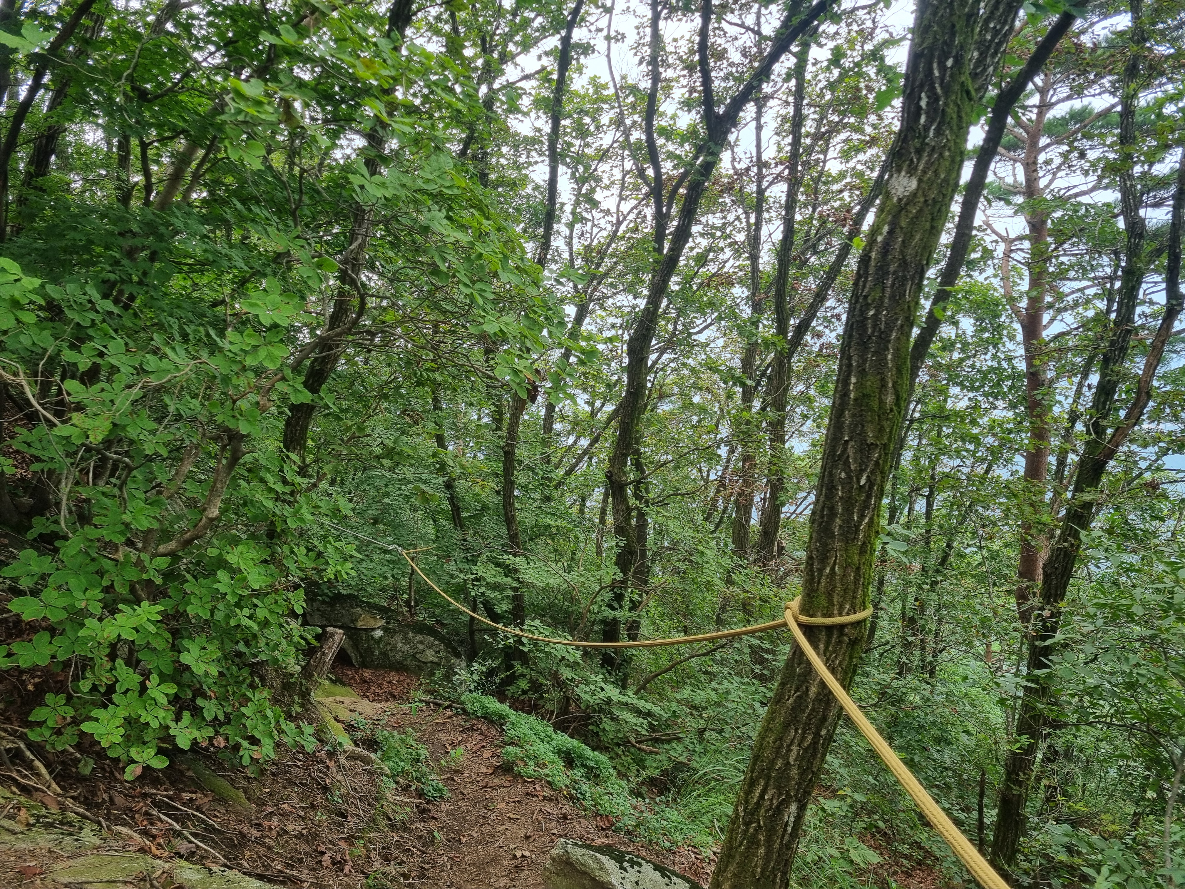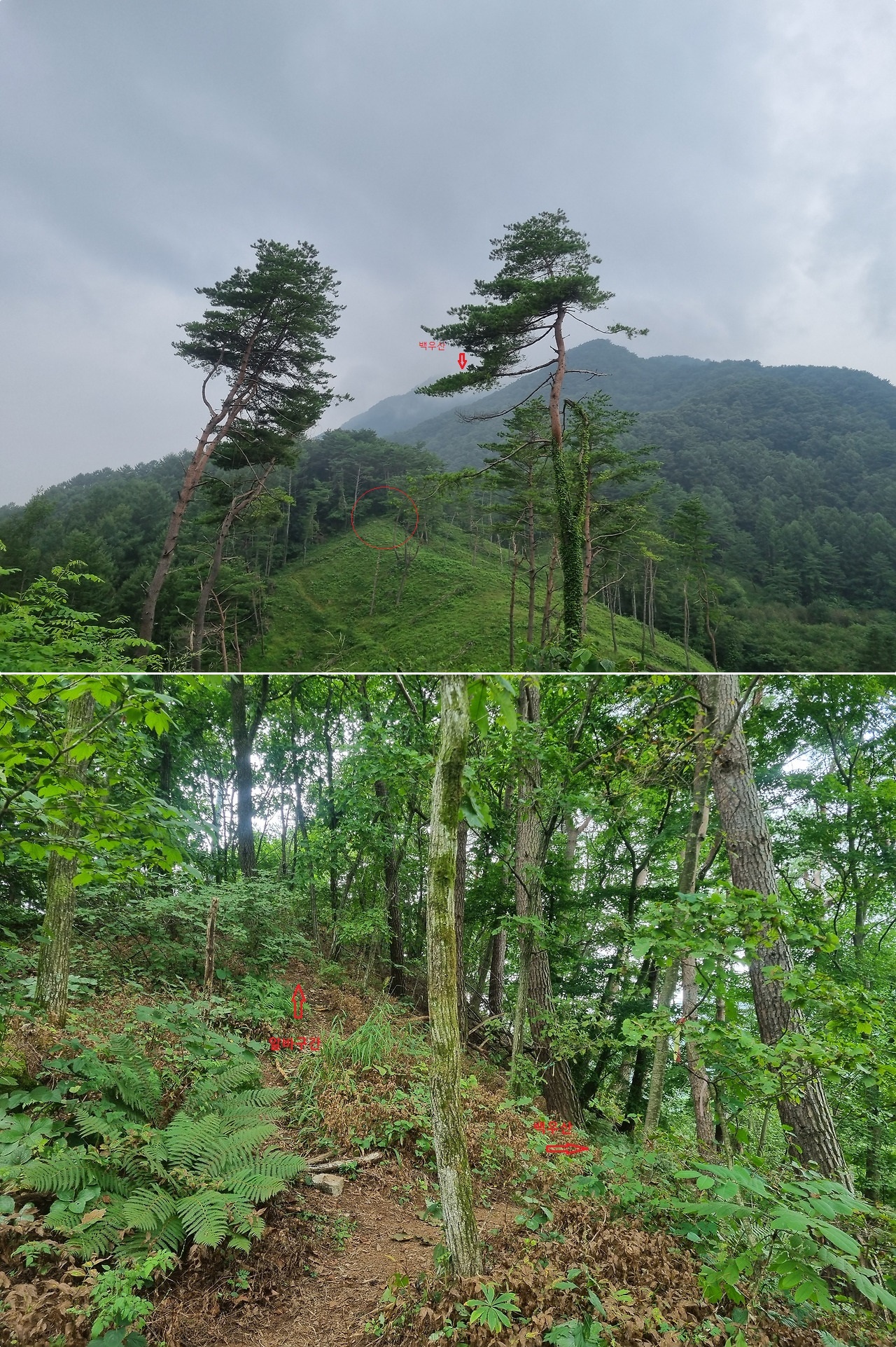 가족고개에서 10분정도 백우산을 바라보며 올라오면 벌목지대를 지나 양갈래 등산로(윗사진 원형)가 나온다. 알바구간은 조금 비탈진 등산로, 백우산으로 향하는 등산로는 평지 수준. 조금가다 보면 만나겠지 하고 아무 생각 없이 알바구간으로 진행. 백우산이 점점 멀어지는 느낌. 잘못됨을 느끼고 다시 양갈래 입구로 되돌아 와서 우측 정상적인 등산로로 백우산을 향하여~~