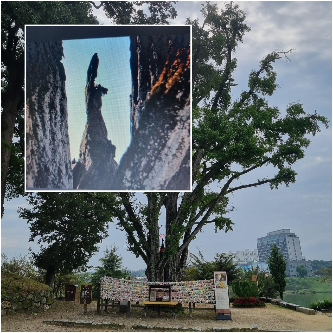 신륵사 은행나무는 660여년전 고려말 공민왕사 나옹스님이 심은 것으로 전해지고 있으며,불,법,승, 삼보를 상징하듯이 세 줄기의 가지로서 모습을 갖추었고, 관세음 보살이 나투(깨달음이나 믿음을 주기 위해 사람들에게 나타내다)신 듯한 희유한 모습으로 자랐으며 또한 관세음보살님이 대자대비로서의 모든 중생들의 괴로움을 구원하시고자 하는 발원으로 신륵사 은행나무에 나투신 것처럼 보인다(사진상 붉은원 안)