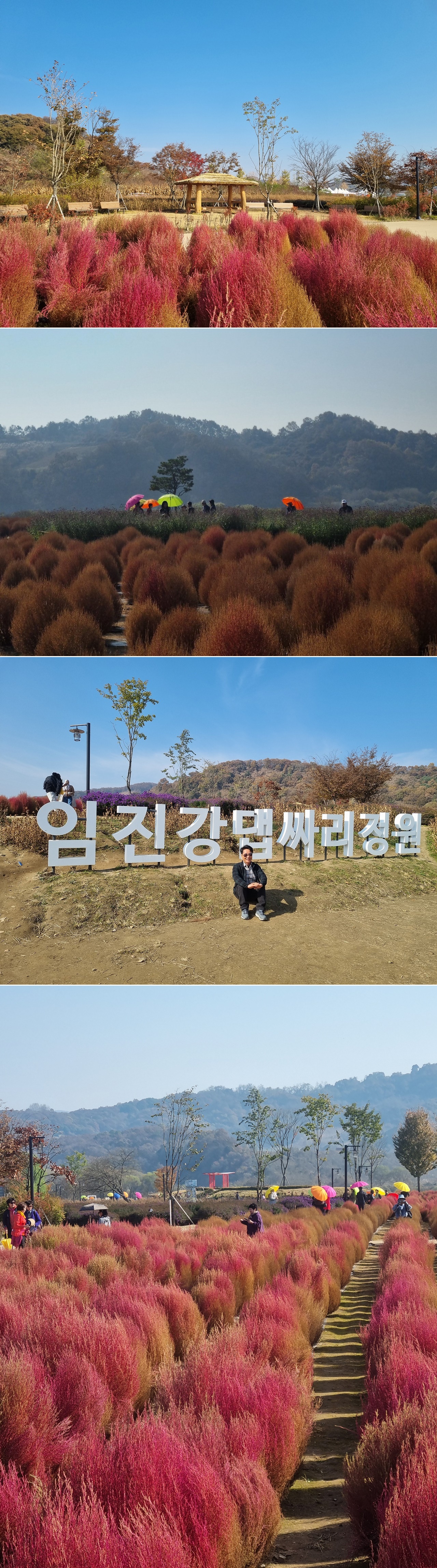 앱이나 필터 없이 사진을 핑크로 물드이는 임진강 댑싸리 정원에서는 이리저리 찍어도 동화속의 주인공이 된다.평일이지만 많은 관광객이 대여한 빨강,노랑,분홍,보라색 무지개 우산을 쓰고 아직 지지않은 핑크로 물들인 댑싸리에서 추억의 사진찍으며 즐거운 시간을 만끽하고 있다.