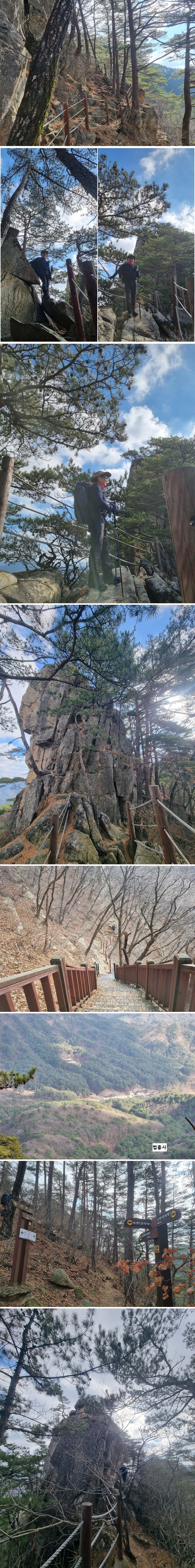 제5봉(大王峰:대왕봉)에서 제6봉( 觀望峰 :관망봉)까지 가는 암릉길은 별거 아닌것 같지만 위험스럽다. 난간 밧줄을 붙잡고 암릉을 내려서는 벼랑길에는 웅장하고 아름다운 적송군락과 자연이 빚어낸 암봉 끝에 절묘하게 자란 소나무 들이 신비로운 분재 같은 너무나 멋진 모습으로 미모를 자랑하면서 발걸음을 유혹하고 있다. 법흥사도 댕겨보면서 연이어 계속되는 안전 밧줄이 설치된 암릉 바윗길 을 따라 6봉으로 향한다.