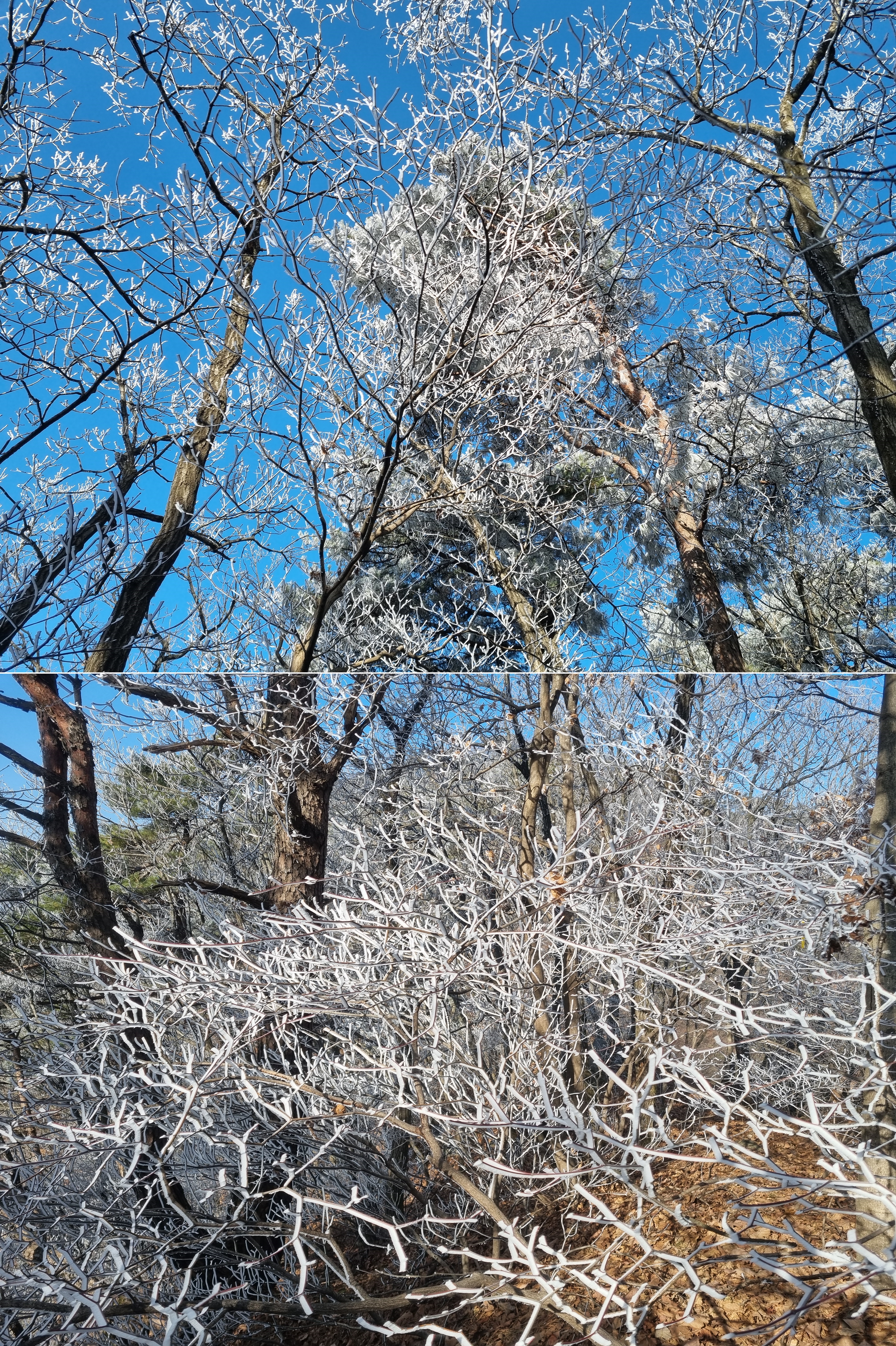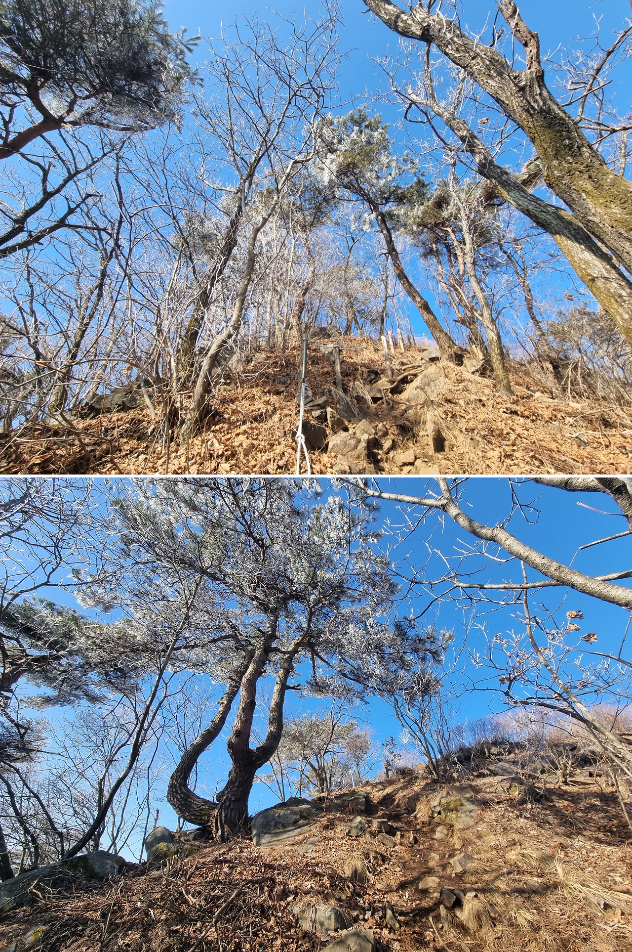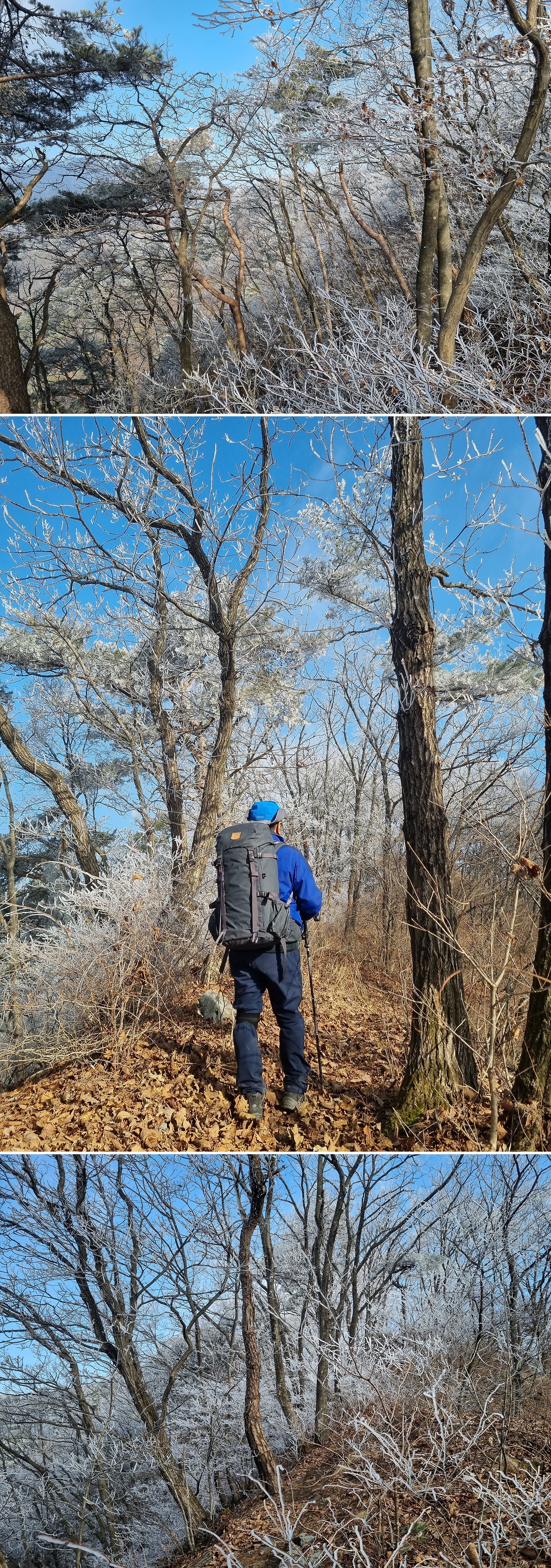 4부 능선 쯤 도착했을때 생각하지도 못했던 상고대를 만난다. 물론 태백산이나 덕유산 등 겨울철 유명 산행지의 아름다운 상고대는 아닐지라도 그나마 이정도의 상고대를 만난것도 행운이라면 행운일것이다.신기한건 등산로는 잔설하나 없이 떨어진 낙엽만 밟히는데 나뭇가지에는 아름다운 상고대 꽃이 피었다는 점이다.이곳에 상고대 꽃이 피었다는건 충주호가 있기 때문일것이다.