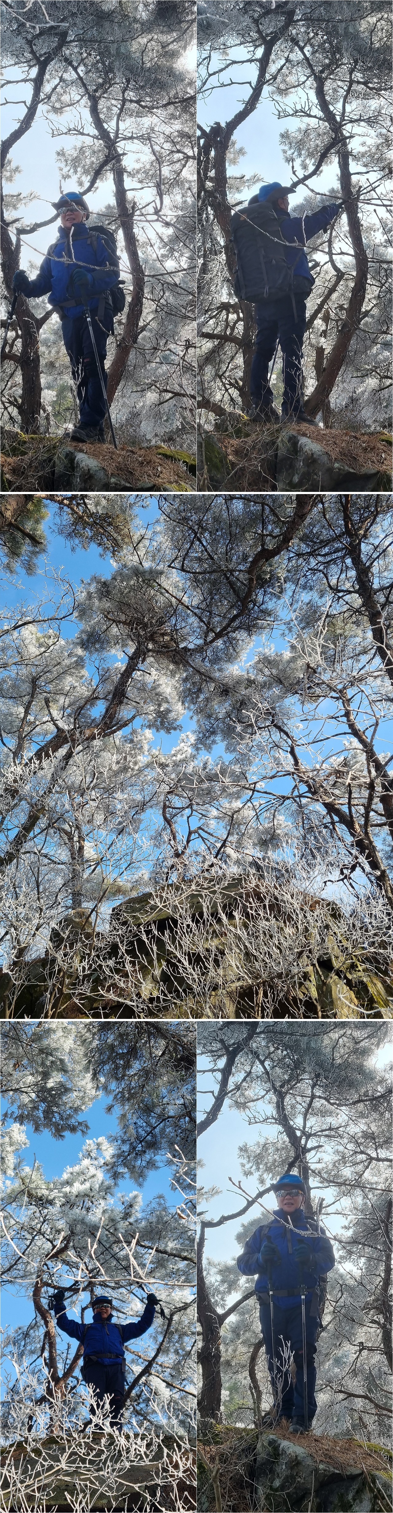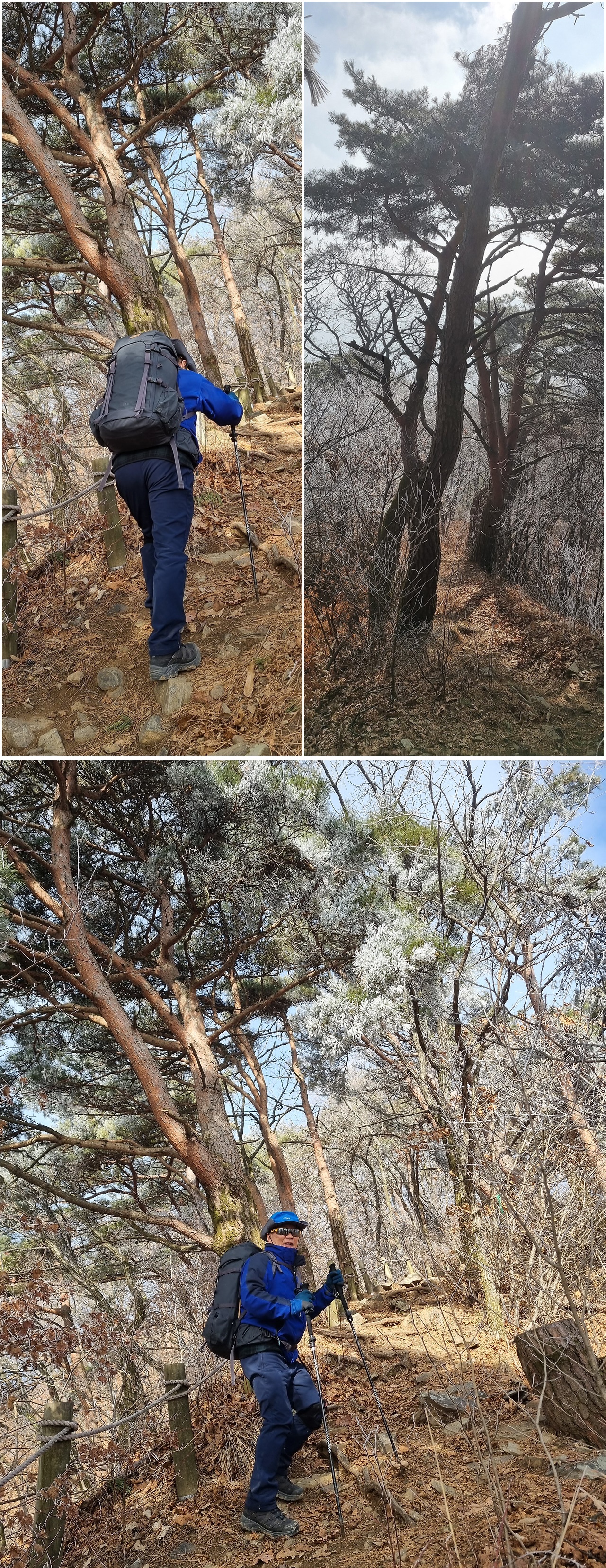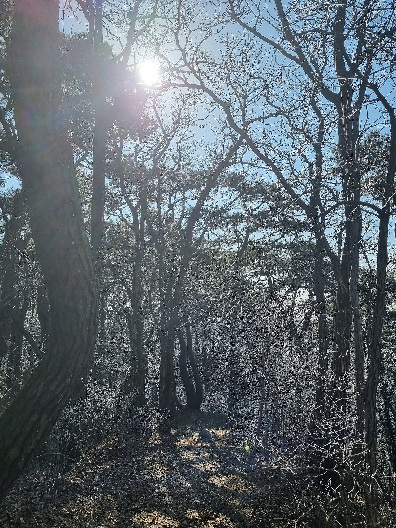 4부 능선 쯤 도착했을때 생각하지도 못했던 상고대를 만난다. 물론 태백산이나 덕유산 등 겨울철 유명 산행지의 아름다운 상고대는 아닐지라도 그나마 이정도의 상고대를 만난것도 행운이라면 행운일것이다.신기한건 등산로는 잔설하나 없이 떨어진 낙엽만 밟히는데 나뭇가지에는 아름다운 상고대 꽃이 피었다는 점이다.이곳에 상고대 꽃이 피었다는건 충주호가 있기 때문일것이다.