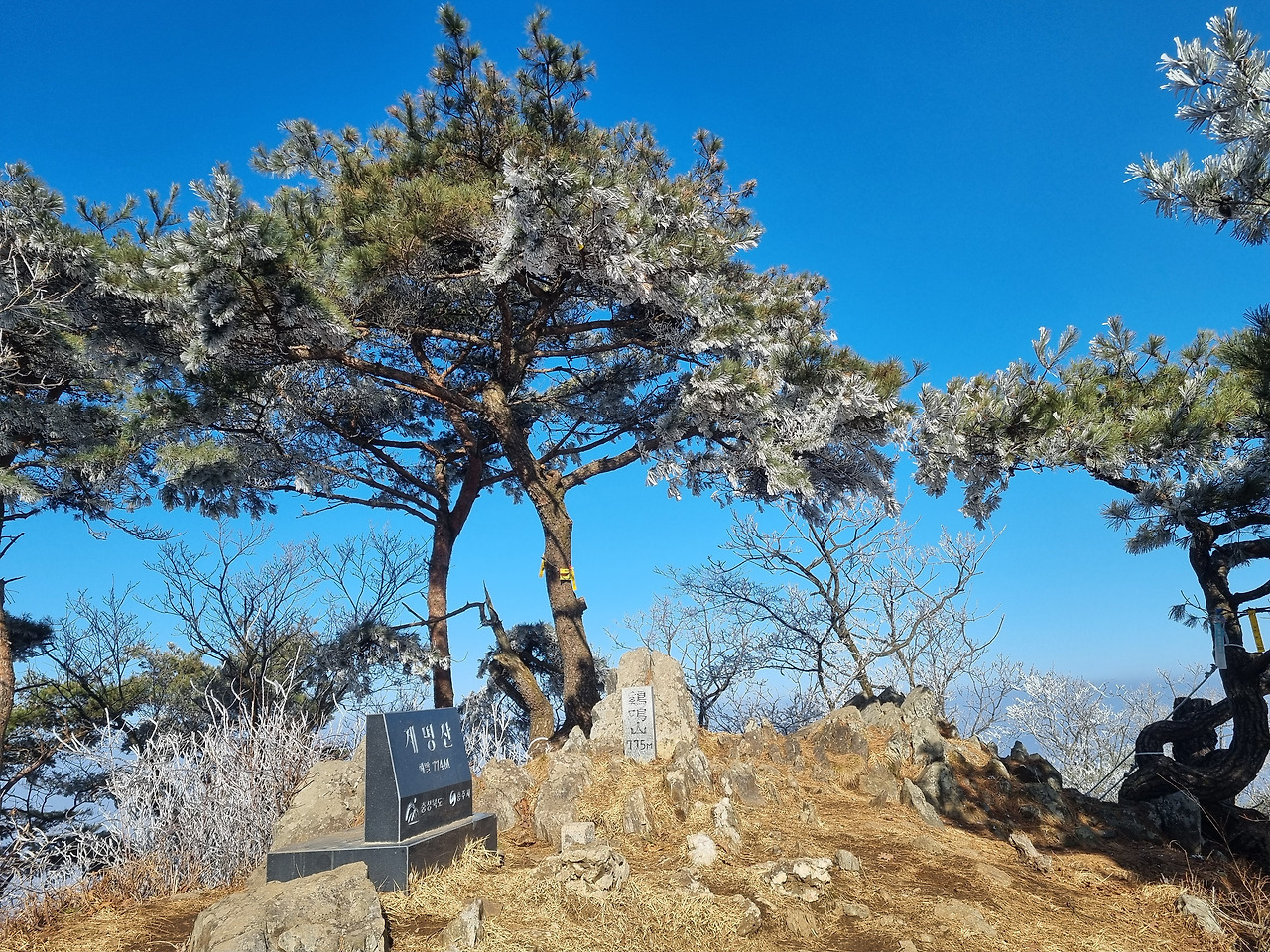 계명산 정상에는 충청북도 충주시에서 설치한 정상석과 충주시청 산악회에서 세운 2개의 정상석이 설치되여져 있다. 충주시에서 설치한 정상석에는 775m, 충주시 산악회에서 설치한 정상석에는 774m 1m의 차이가 있다 정상에 서면 월악산 영봉등~~ 산그리메가 눈 앞에 들어오고 충주호가 시원하게 펼쳐진다.